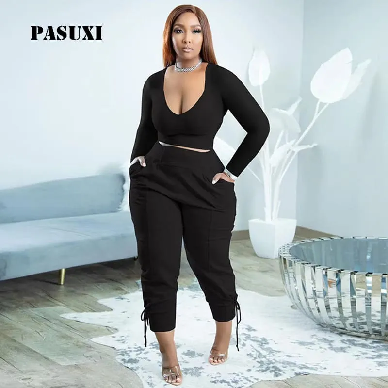 PASUXI Sexy V Neck Solid Color Lace Up Trousers Casual Two Piece Suit for Women Trendy Fashion Set