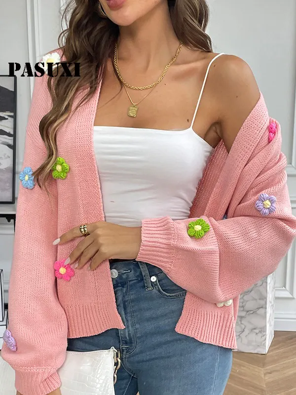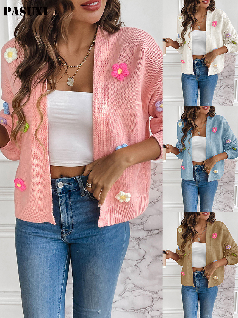 PASUXI Women's Flower Pattern V-Neck Cable Knit Long Sleeve Sweater Cardigan